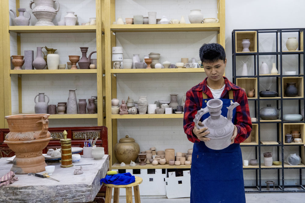 ↑ 8月6日,一名制陶师在欣赏自己的作品。藏族传统泥陶雕塑制作技艺入选西藏自治区级非物质文化遗产代表性项目名录。