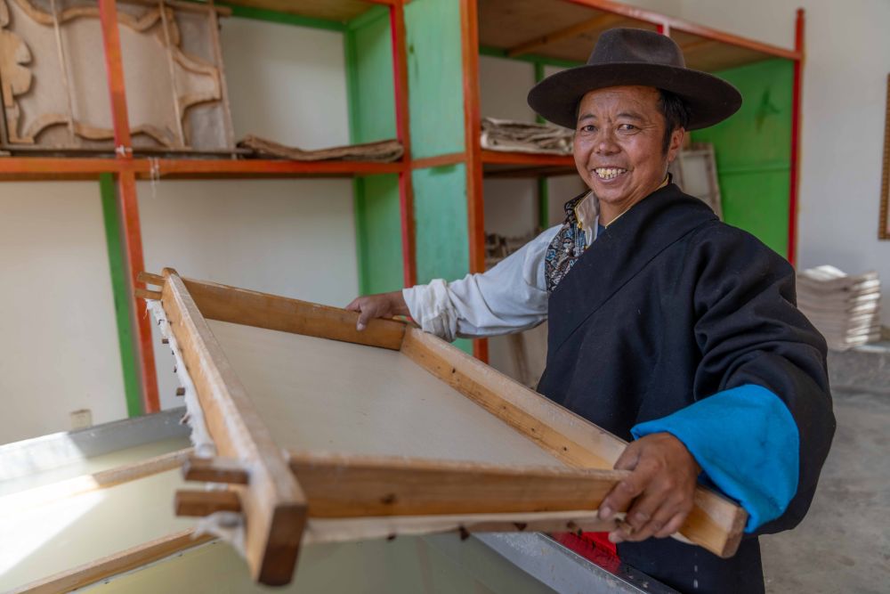 ↑ 8月12日,雪拉藏纸制作技艺自治区级代表性传承人格桑旦增在制作藏纸。