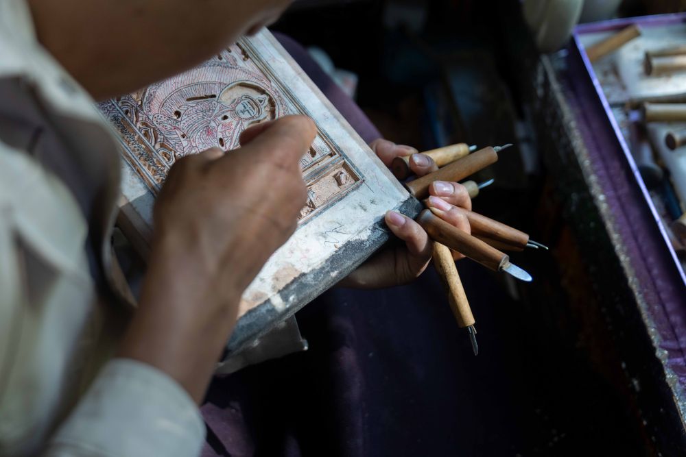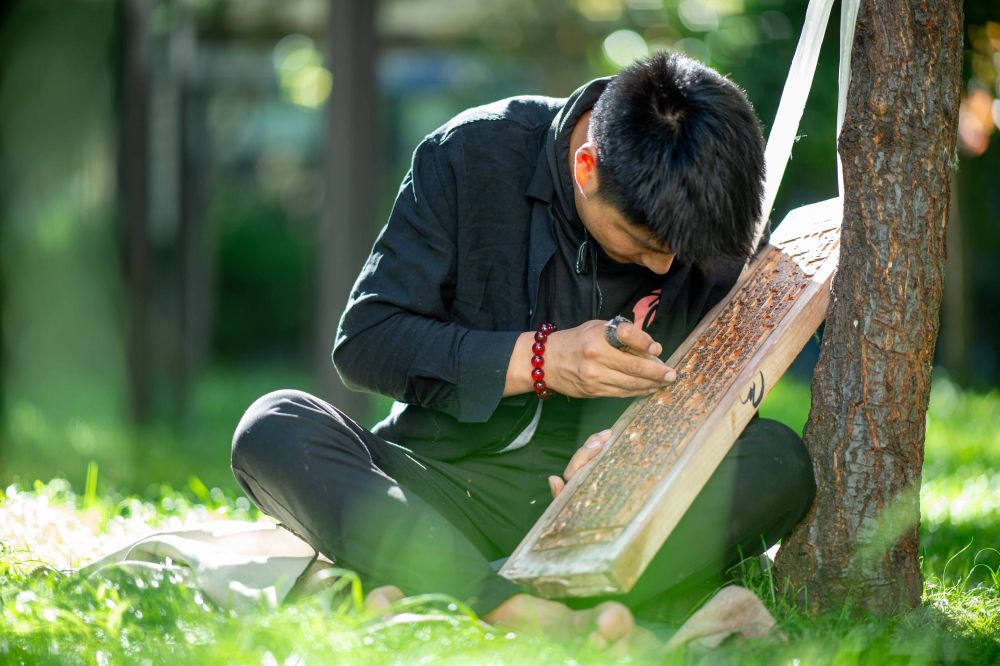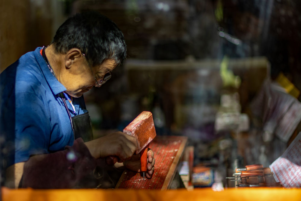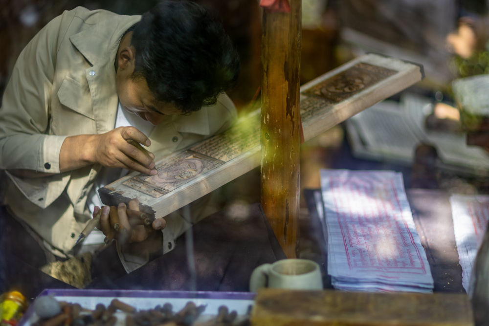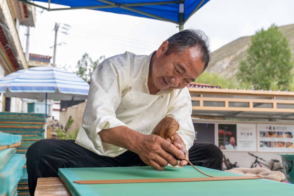 ↑ 8月6日,一名雕刻师在雕刻中。西藏雪巴康雕版印刷制作技艺入选西藏自治区级非物质文化遗产代表性项目名录。