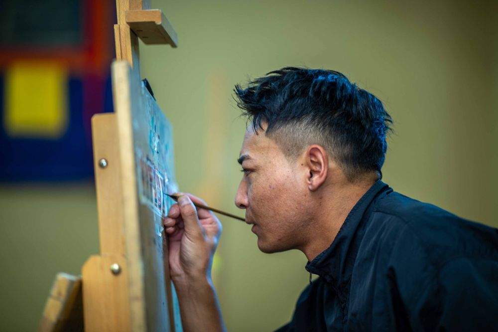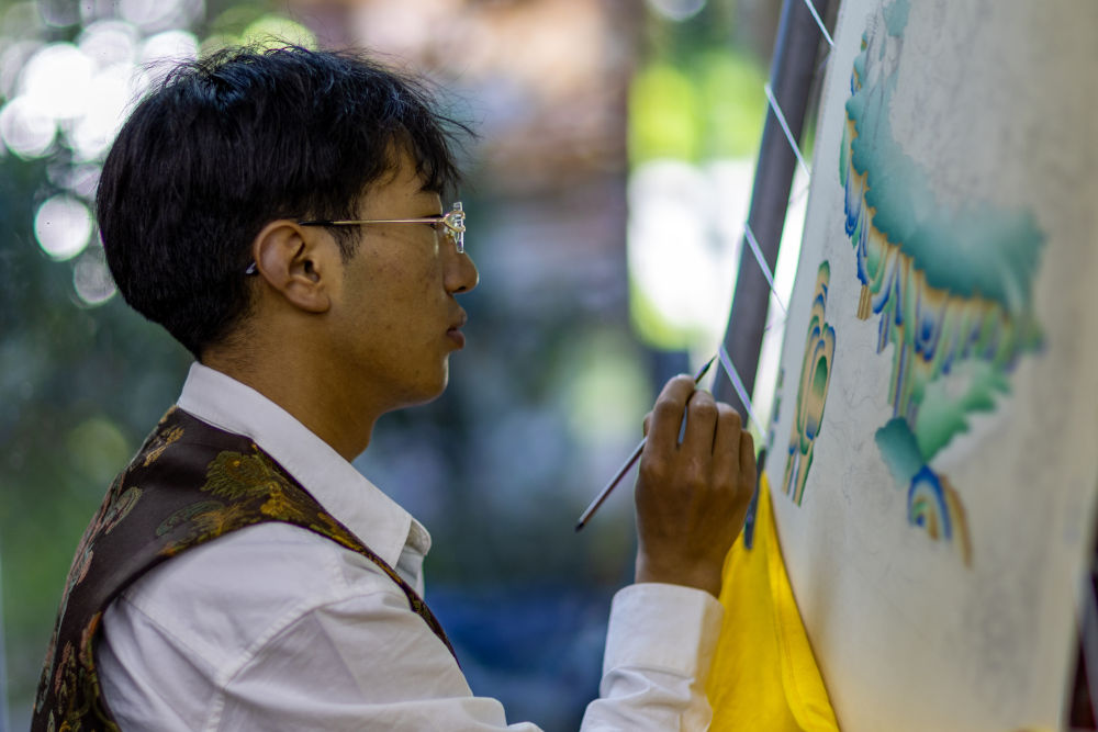 ↑ 8月6日,一名画师在绘制唐卡。藏族唐卡入选国家级非物质文化遗产代表性项目名录。